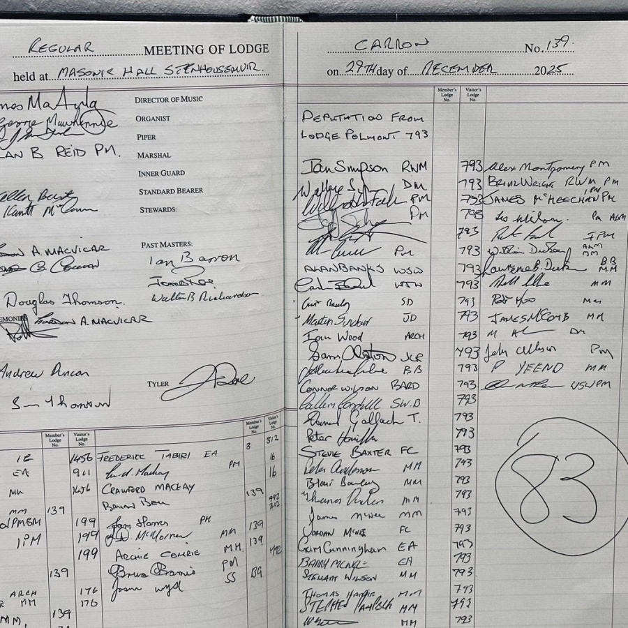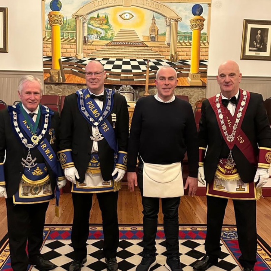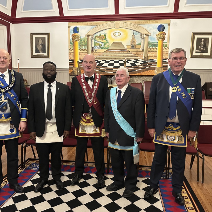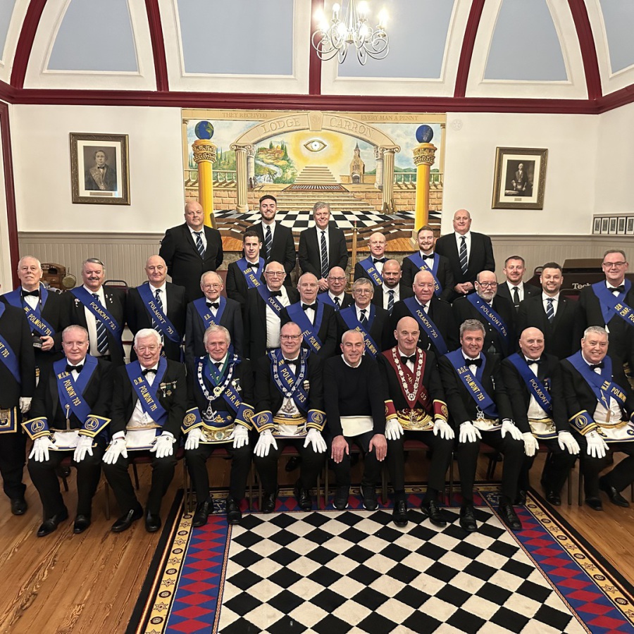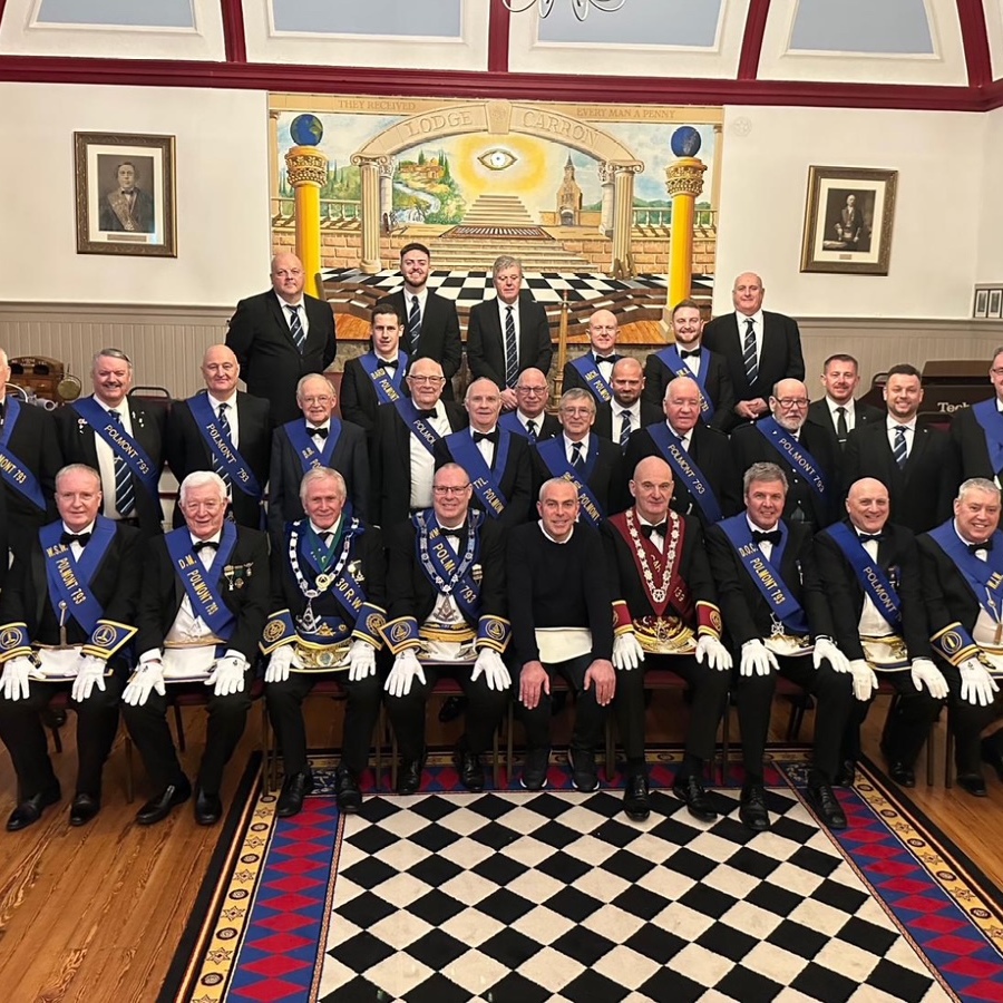 On Monday 29th December 2025 Lodge Carron No.139 invited Lodge Polmont No.793 to confer the Entered Apprentice Degree on 1 Candidate Mr Graeme Hardie. RWM Brother Ian Simpson entered the Lodge with a deputation of 43 including RWM's,PM's,OB's and Brethren. RWM Brother Jim MacAulay extended a warm welcome to the deputation into the Lodge who then invited RWM Brother Ian Simpson to the East. RWM Brother Jim MacAulay then presented the Gavel to RWM Brother Ian Simpson to allow him to confer the degree. At the conclusion of the degree RWM Brother Simpson congratulated his team of OB's on an excellent degree which was carried out with great precision and dignity, he also thanked PM Brother Alan Reid of Lodge Carron for his musical arrangements. RWM Brother Simpson then thanked RWM Brother MacAulay for the honour of conferring the degree. The deputation then retired from the Lodge to accept the kind hospitality of the Lodge. Photos by kind permission